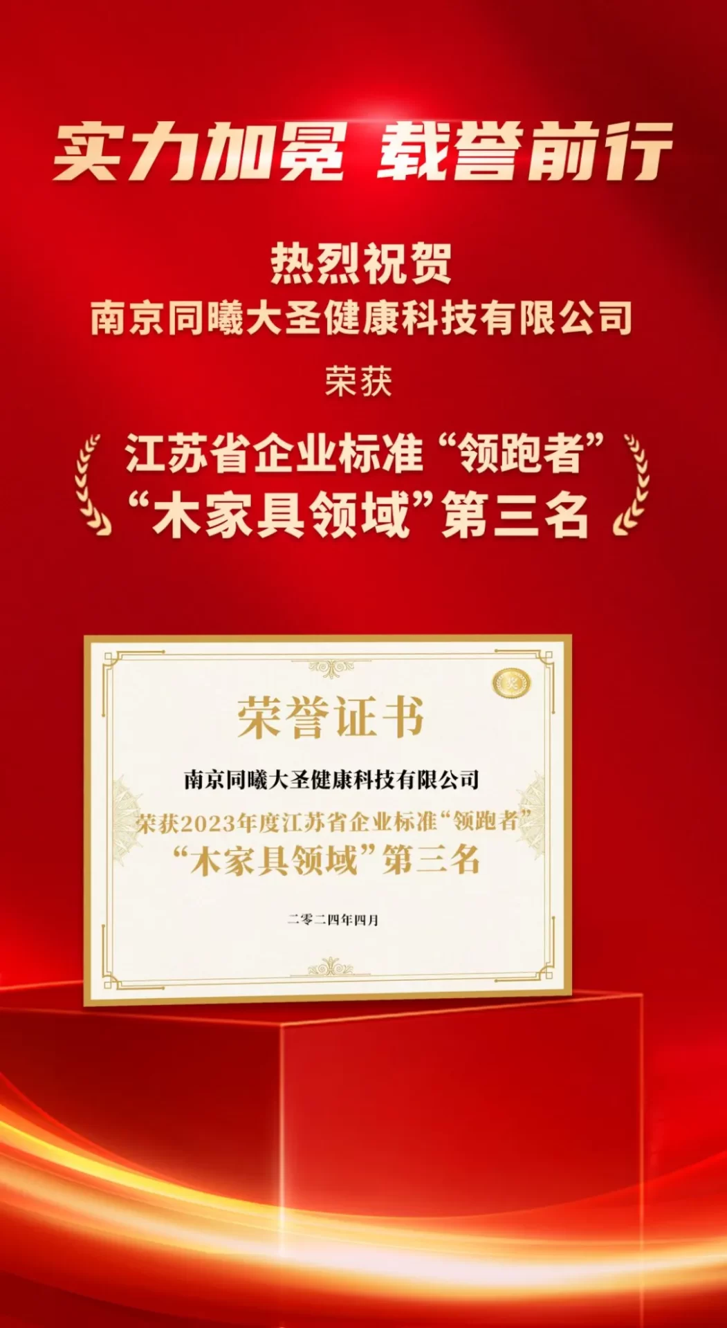 2024年4月,经过产品检测、专家评审、专业机构多方评估认定,2023年度江苏省企业标准“领跑者”名单公布,南京同曦大圣健康科技有限公司在木家具领域39个候选企业中位列第三,其企业标准Q/320115TXDS002-2022《抗菌儿童家具》倍受市场认可。
