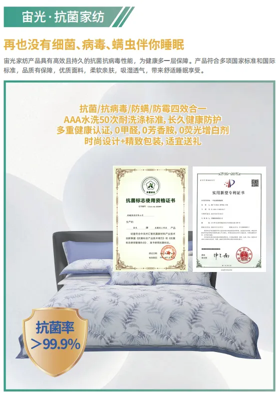 “宙光抗菌产品执行严格的品质标准,经过国内外权威的第三方检测机构检测认证,具有优异的抗菌、抗病毒、防霉、防螨效果。凡是了解宙光产品的用户,都极有可能成为它们的忠实用户。”一向低调的陈广川谈及宙光产品,自信满满。