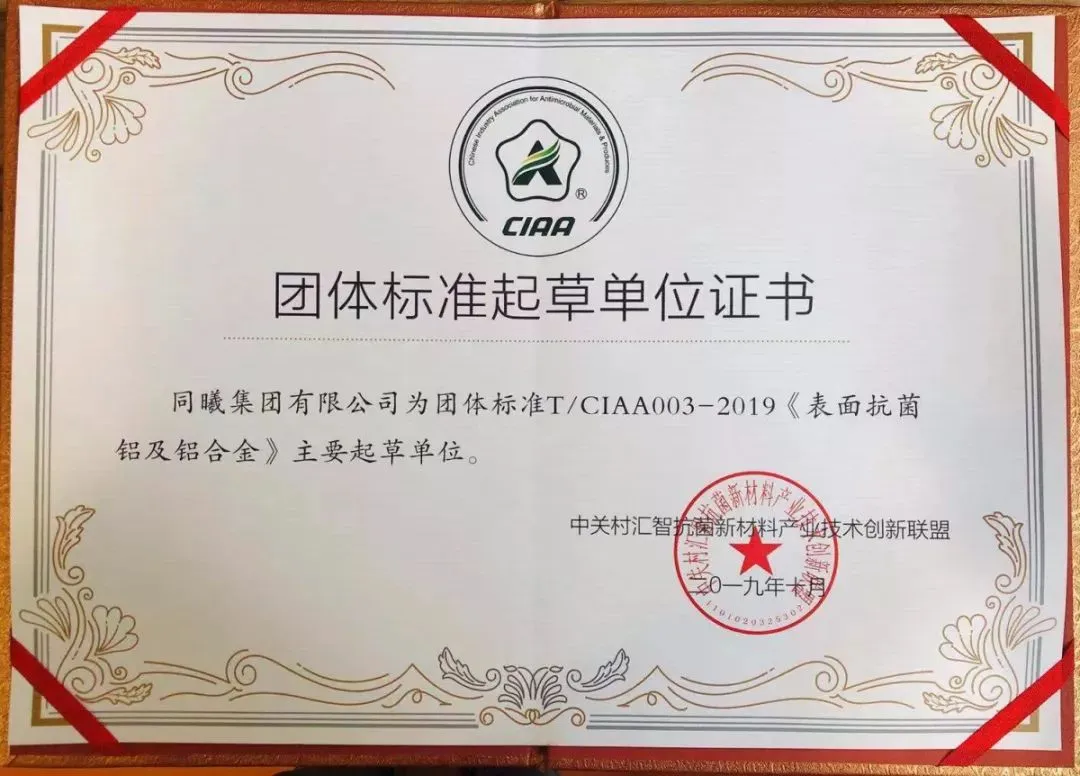2019年10月,同曦集团牵头制定《表面抗菌铝及铝合金》团体标准正式实施。