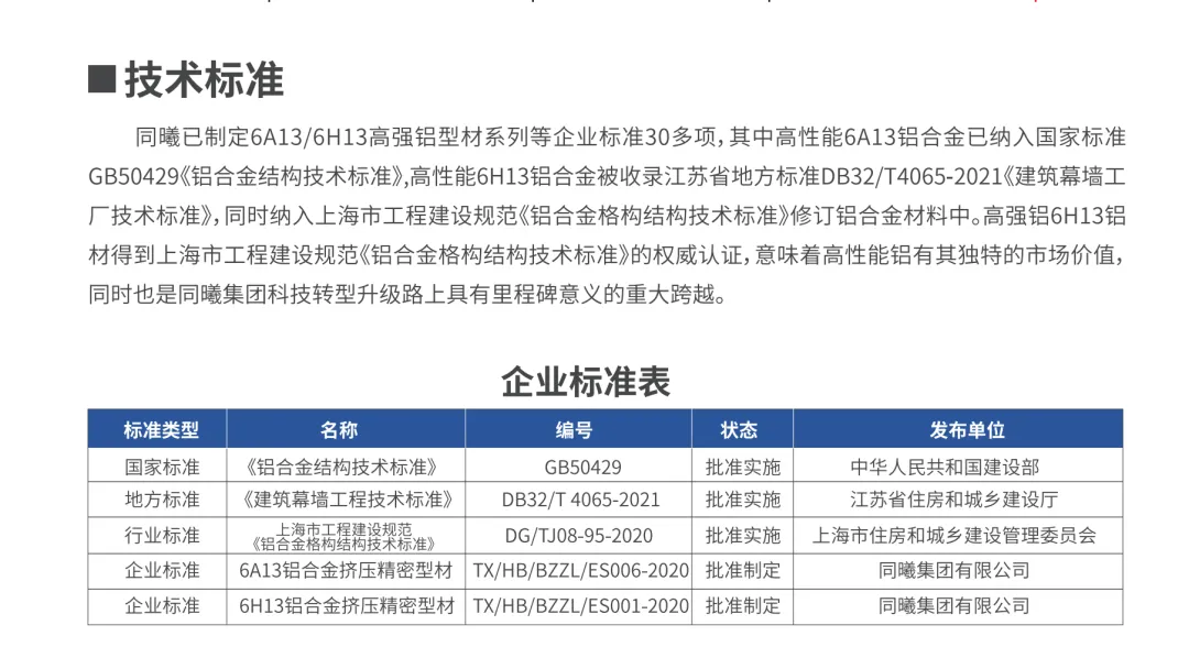 其中,同曦集团自主研发的高性能铝合金6A13、6H13、6J13、6AK6具有优异的力学性能、高亮度和极强的高温耐热、耐蚀性能,并在全国有色金属标准化技术委员会成功注册牌号,分别纳入国家标准GB50429《铝合金结构技术标准》和上海市工程建设规范《铝合金格构结构技术标准》修订铝合金材料中。