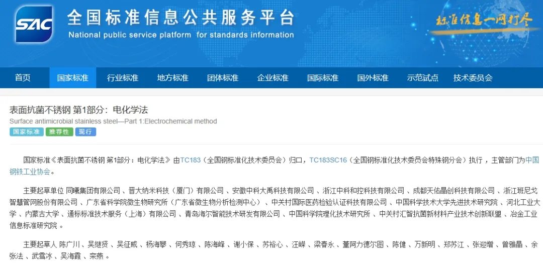 其中,由同曦集团作为第一起草单位、陈广川作为主要起草人主导并参与制定的最新国家标准GB/T 24170.1-2023 《表面抗菌不锈钢 第1部分:电化学法》,已于2024年4月1日在全国范围内正式实施。
