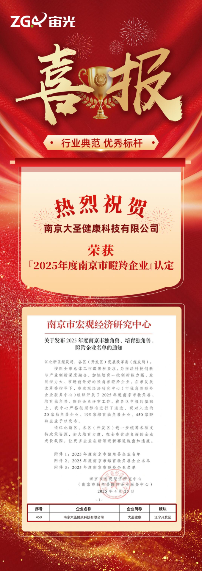 2025年4月25日,南京市宏观经济研究中心公布了2025年度南京市独角兽、培育独角兽、瞪羚企业名单,南京大圣健康科技有限公司荣登“2025年度南京市瞪羚企业”榜单。