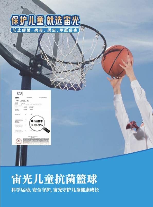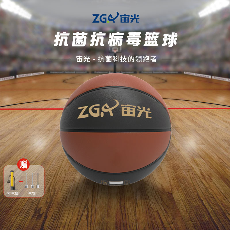 在传统篮球的基础上,宙光创新融入银锌复合纳米抗菌专利技术,通过特殊的后整理工艺,使篮球表面形成持久有效的抗菌抗病毒防护层: