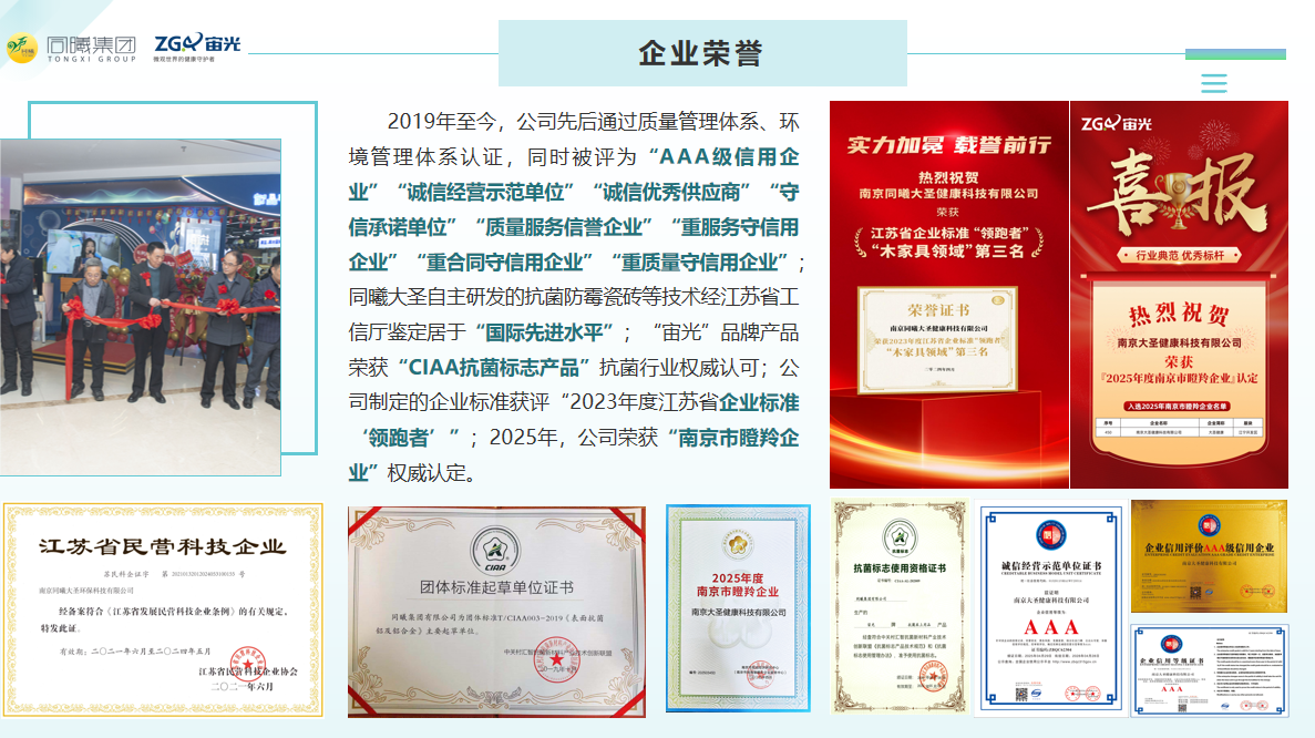 同曦宙光掌握的纳米抗菌技术、高效抗病毒技术、金属表面抗菌技术、光触媒抗菌专利技术、耐洗长效抗菌后整理技术、抗菌耐磨高温烧结技术等六大核心关键抗菌技术,持续突破产品研发壁垒,用健康科技重新定义抗菌功能。